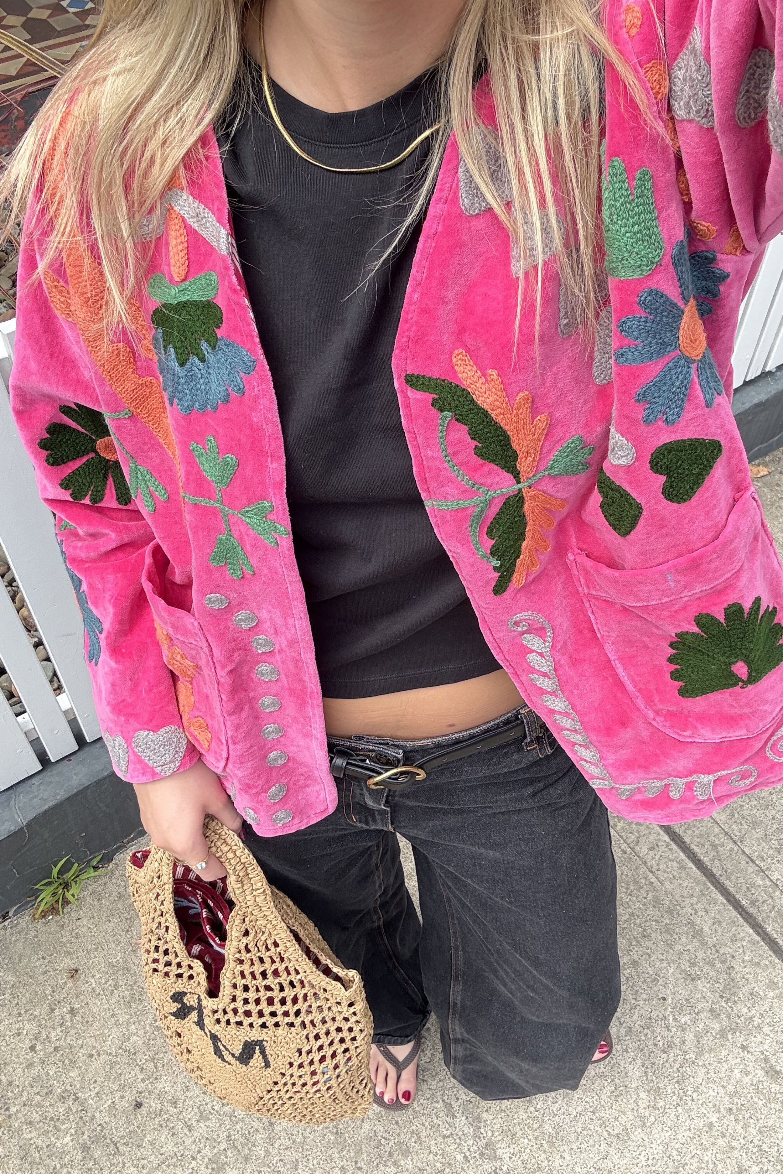 Embroidered Velvet Jacket - Bright Pink with Multi Pattern