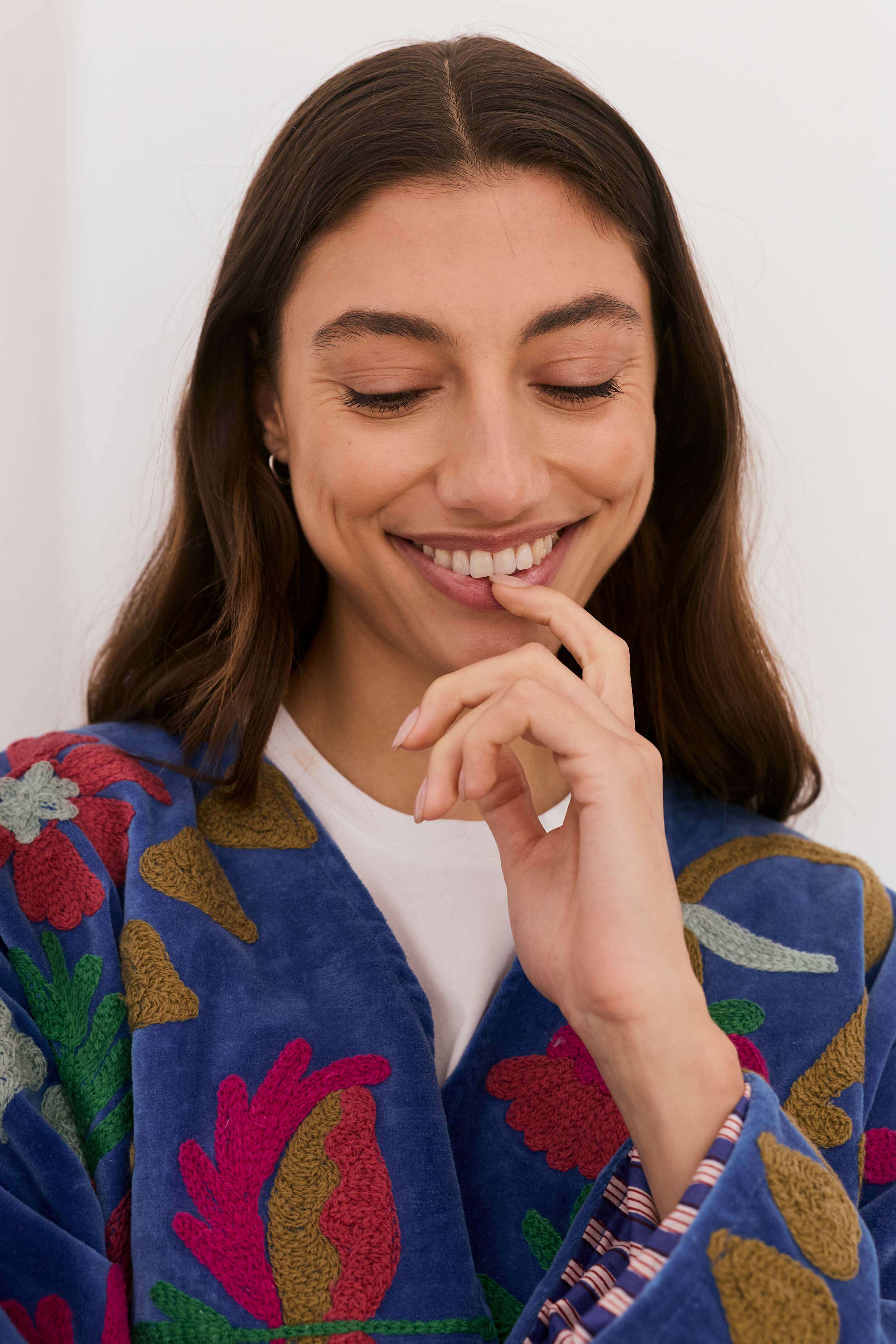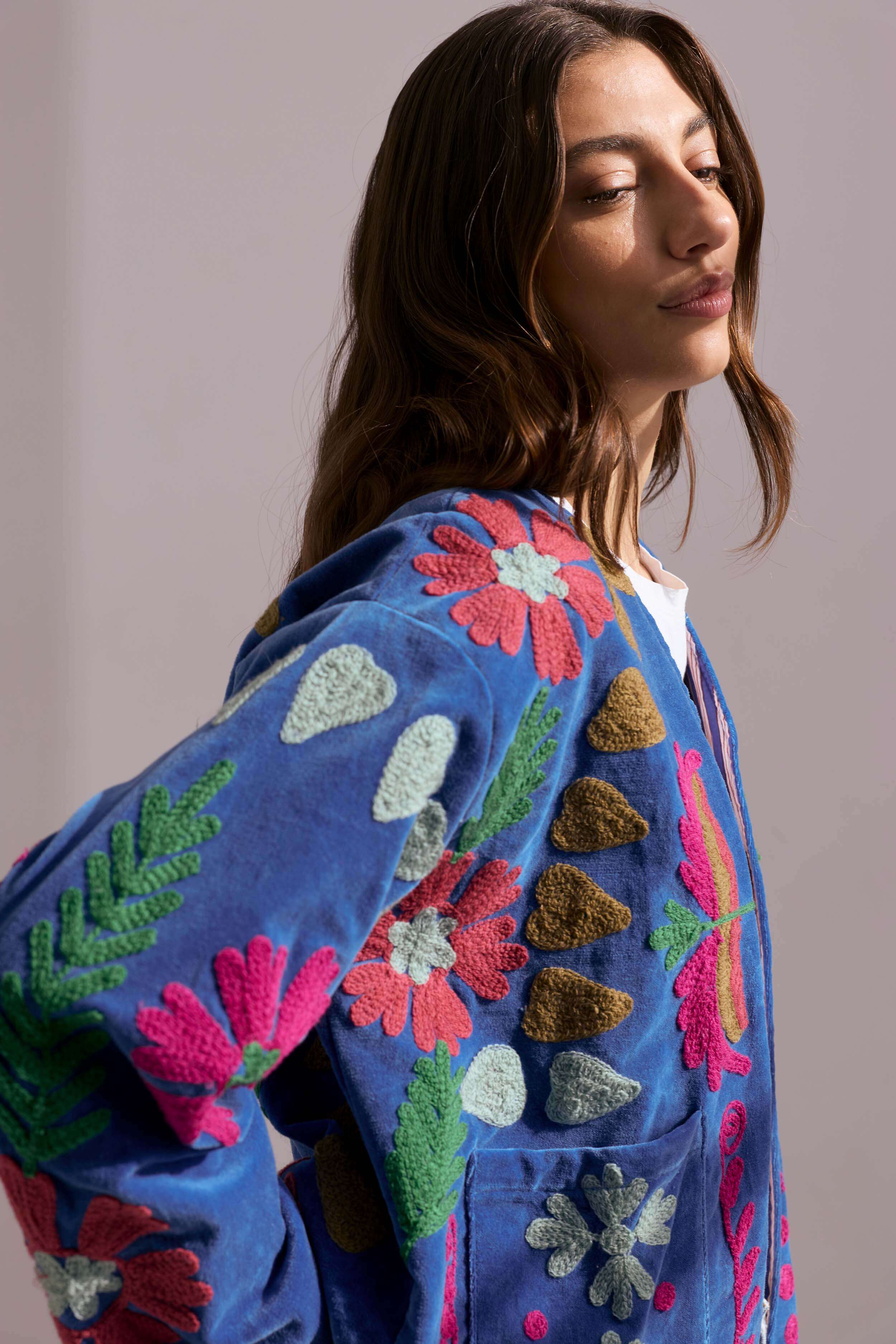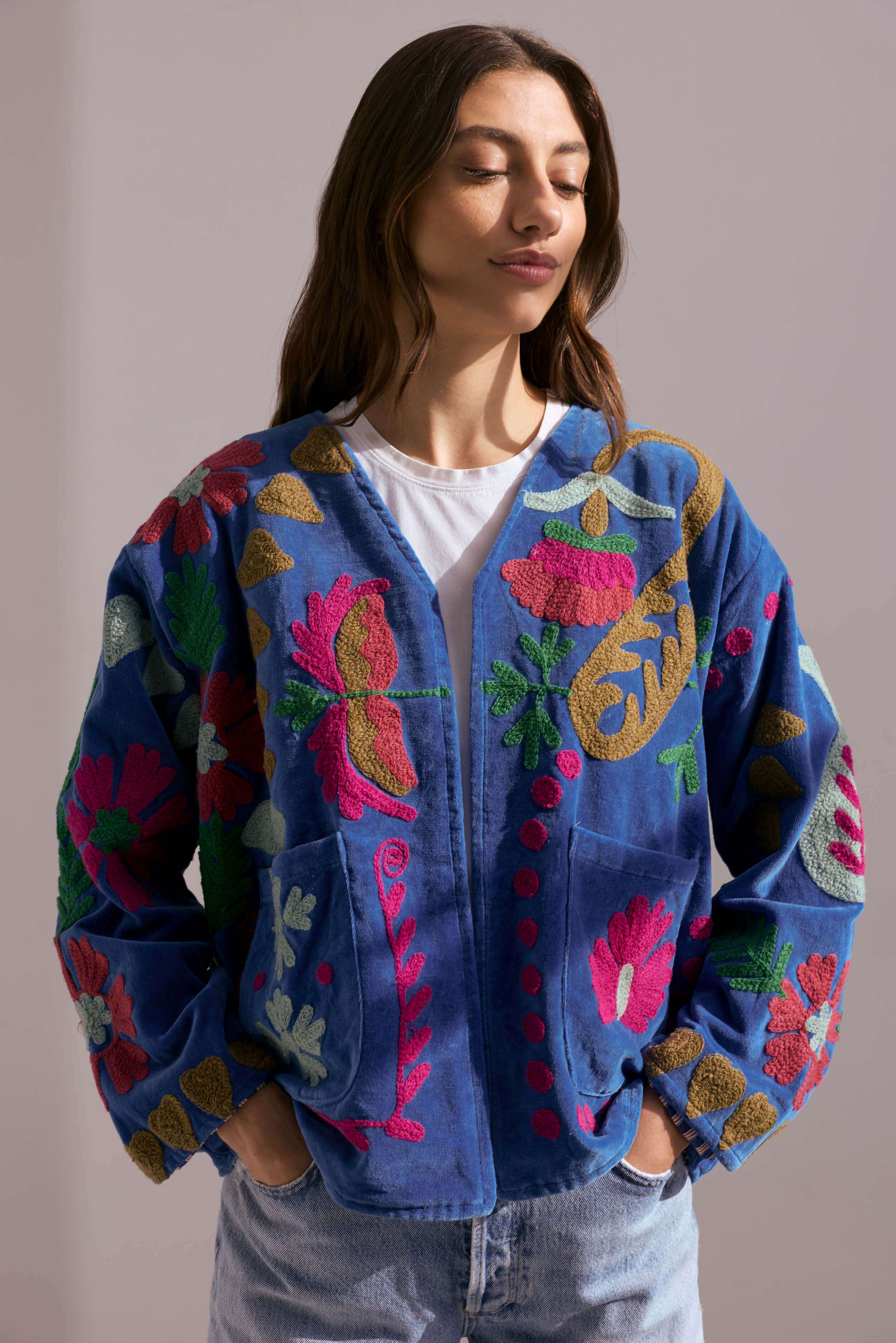 Each of these handmade velvet jackets is a wearable work of art. Crafted in India by skilled artisans, every piece features vibrant, intricate embroidery on a rich velvet base, making no two jackets the same.