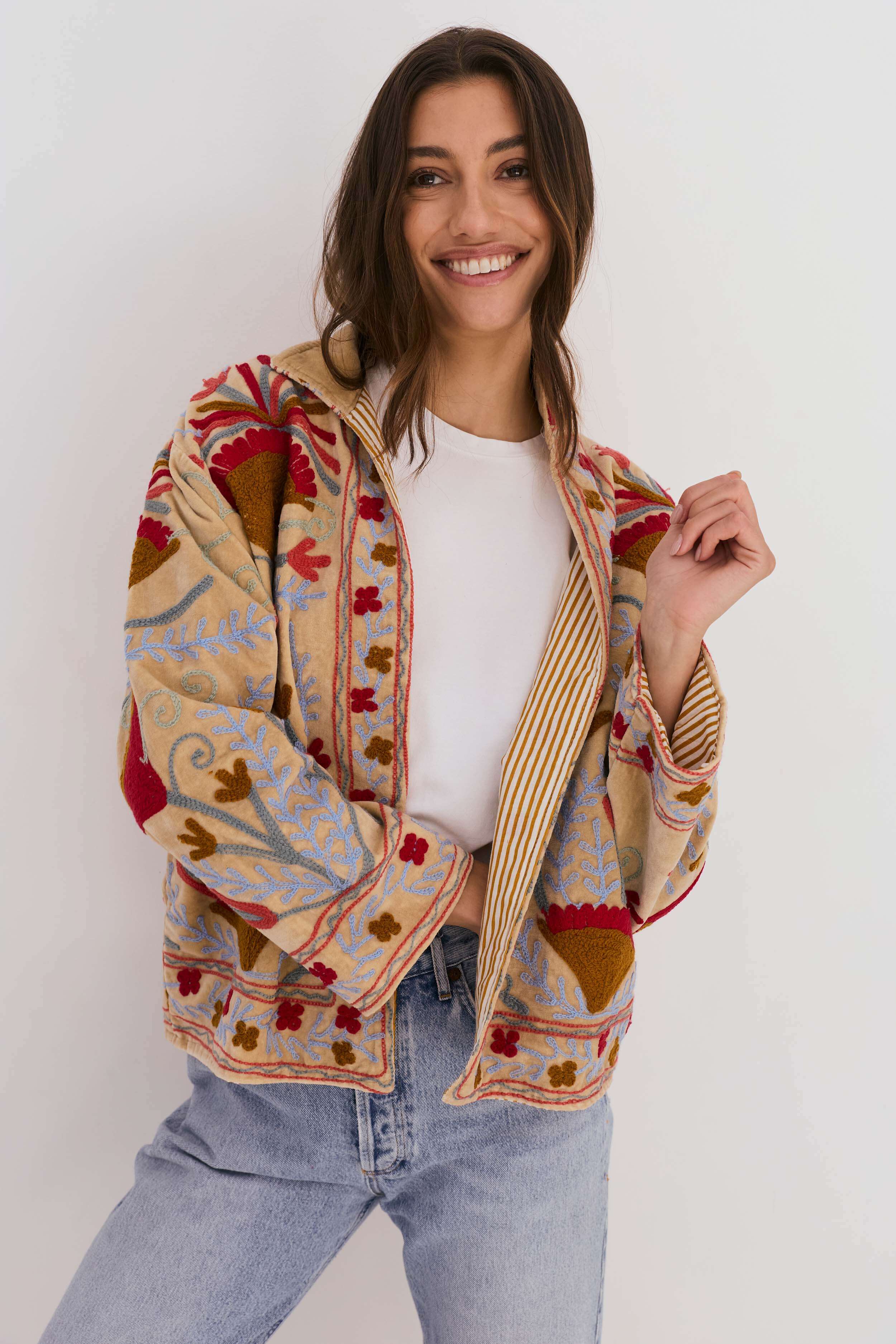 Each of these handmade velvet jackets is a wearable work of art. Crafted in India by skilled artisans, every piece features vibrant, intricate embroidery on a rich velvet base, making no two jackets the same.