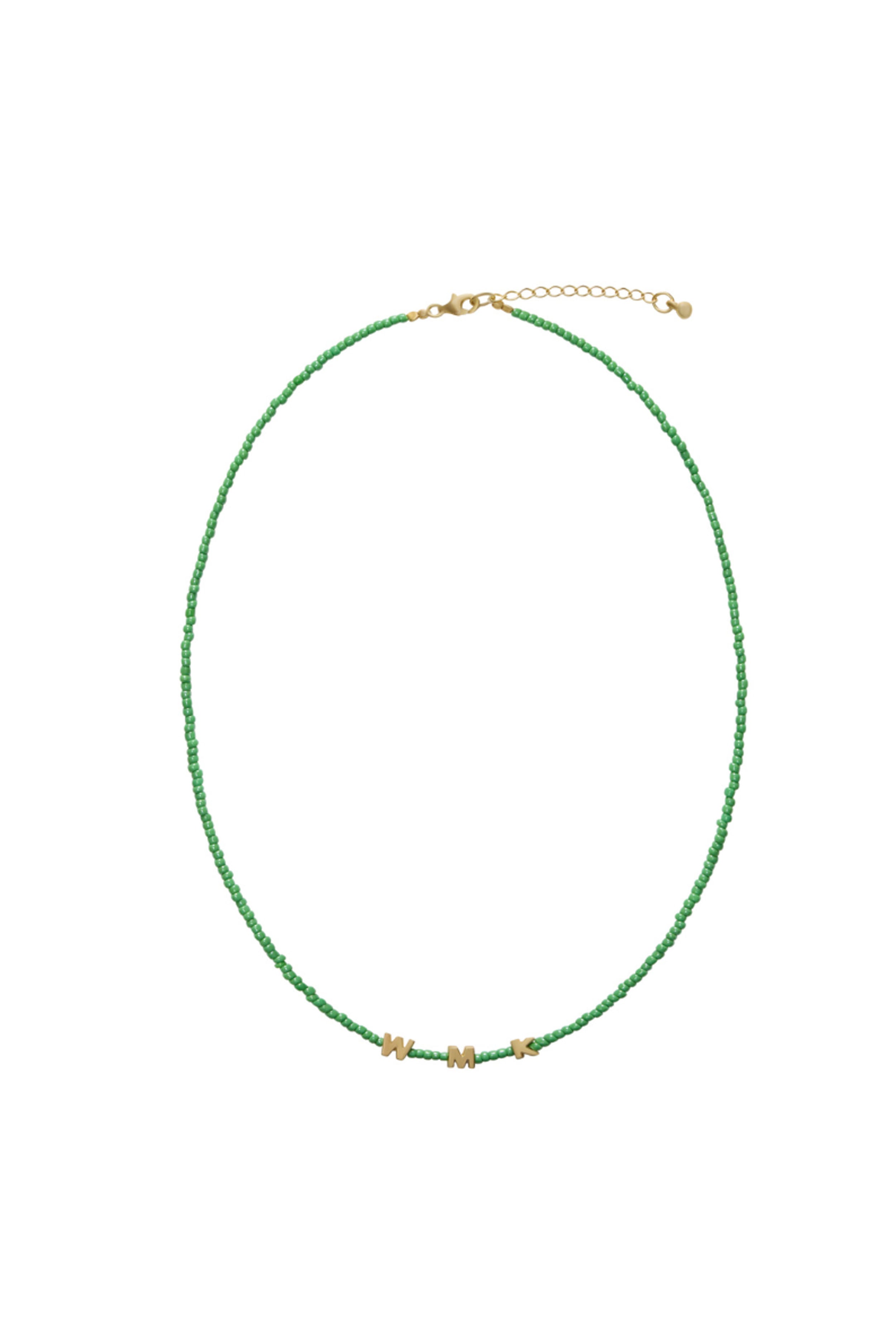 - Hand-beaded necklace in Blue, Green, or Multicolour with luxe gold hardware