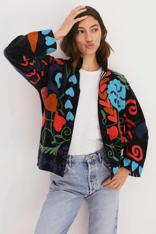 Embroidered Velvet Collared Jacket - Black with Multi Pattern